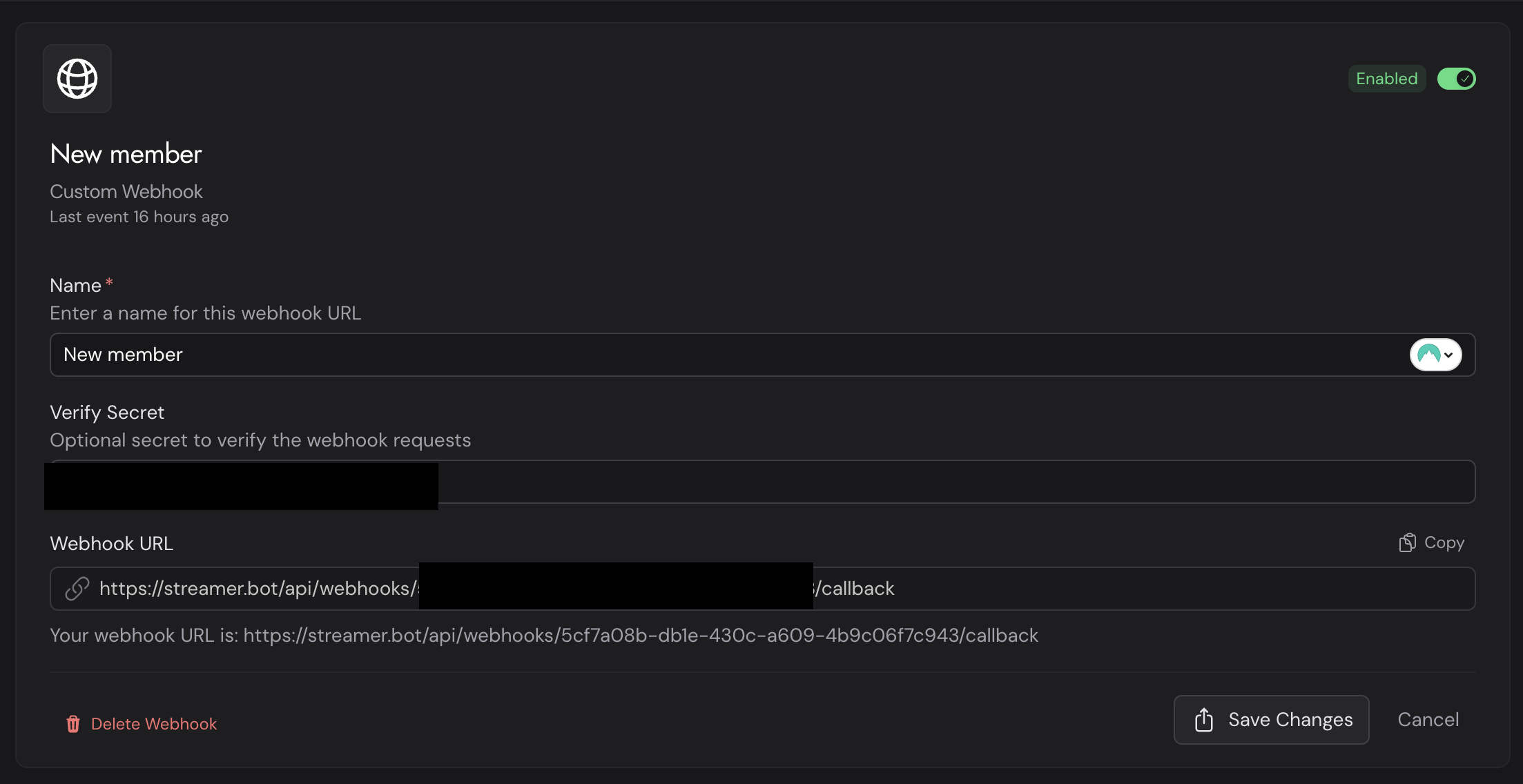 Click on save, and you're done! You can test this by creating a new member in your dashboard. You can use a test name and email, then save the details. If it's successful, then you should see it appear in your Webhook Request History on your Streamerbot webhook page.
