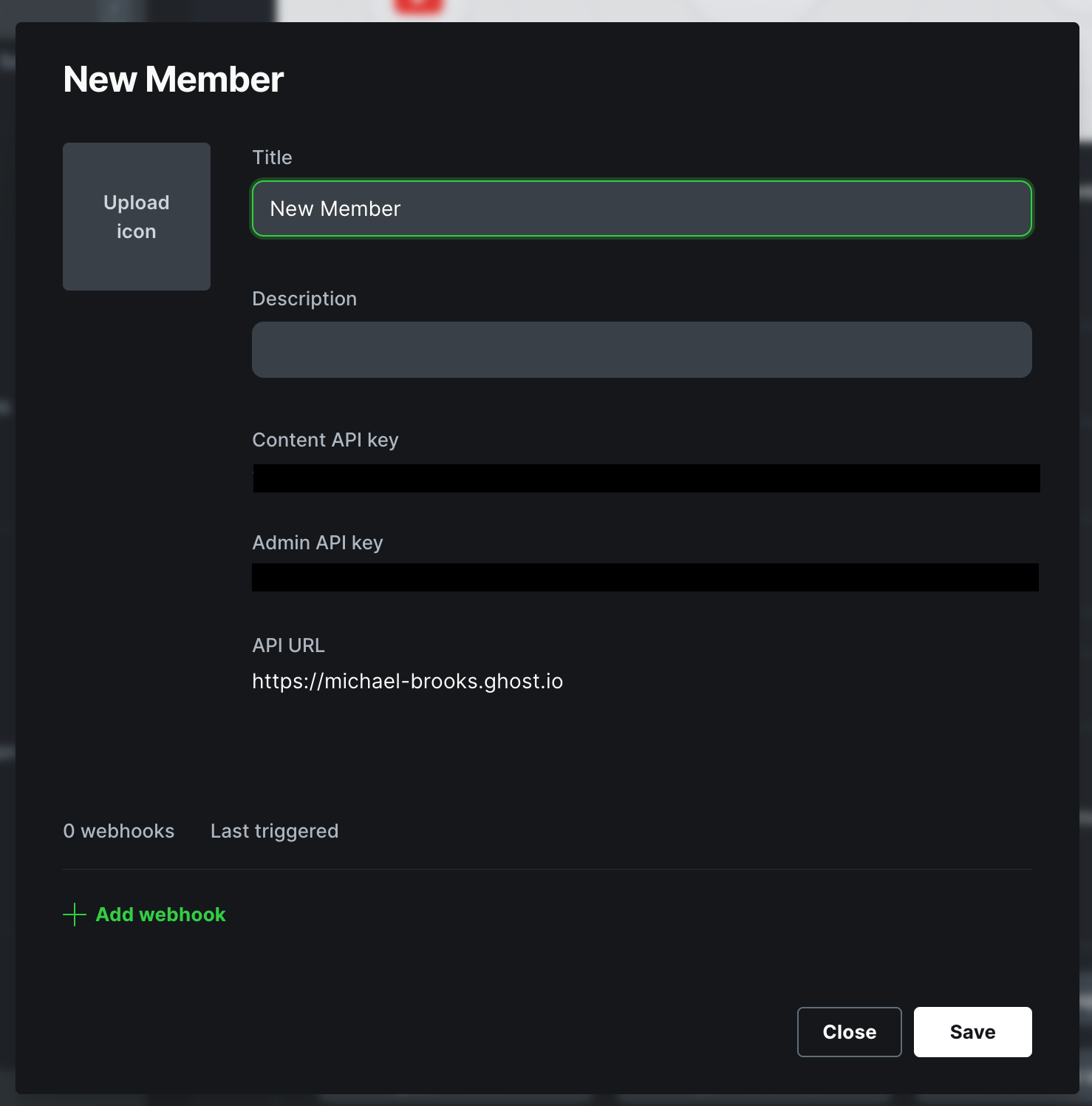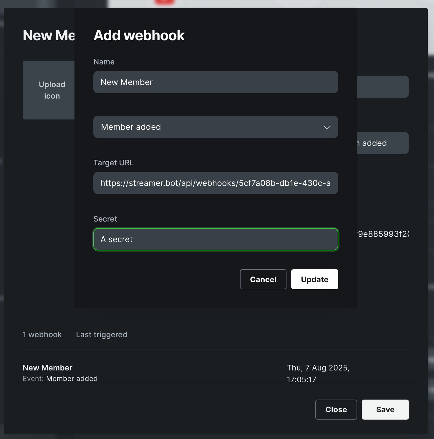Click the "Add Webhook" link located at the bottom of the modal. Give this a name, again, I called it New Member. Within the event dropdown, I selected Member added, but you can choose any event you would like to record for your webhook. Set the target url to the webhook url that's in your Streamerbot webhook. If you created a webhook secret, copy and paste it into Ghost's secret input field.