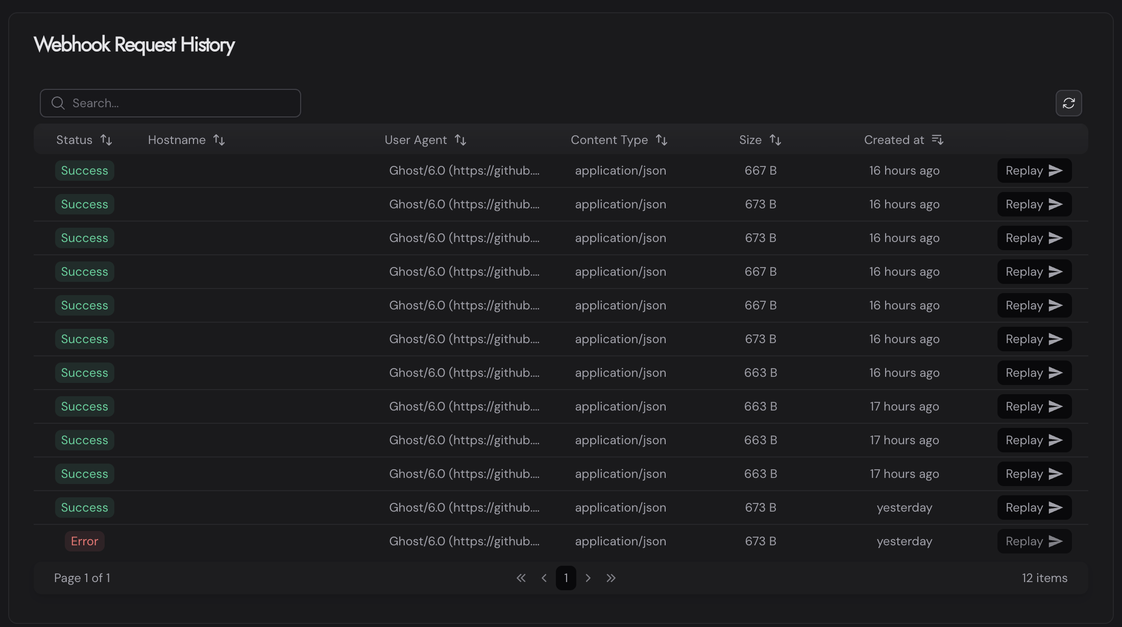 You can then test this works by creating a new member in your Ghost members section. You can use any name, and any email address and once submitted, it should go into the request history on the Streamerbot webhooks page.