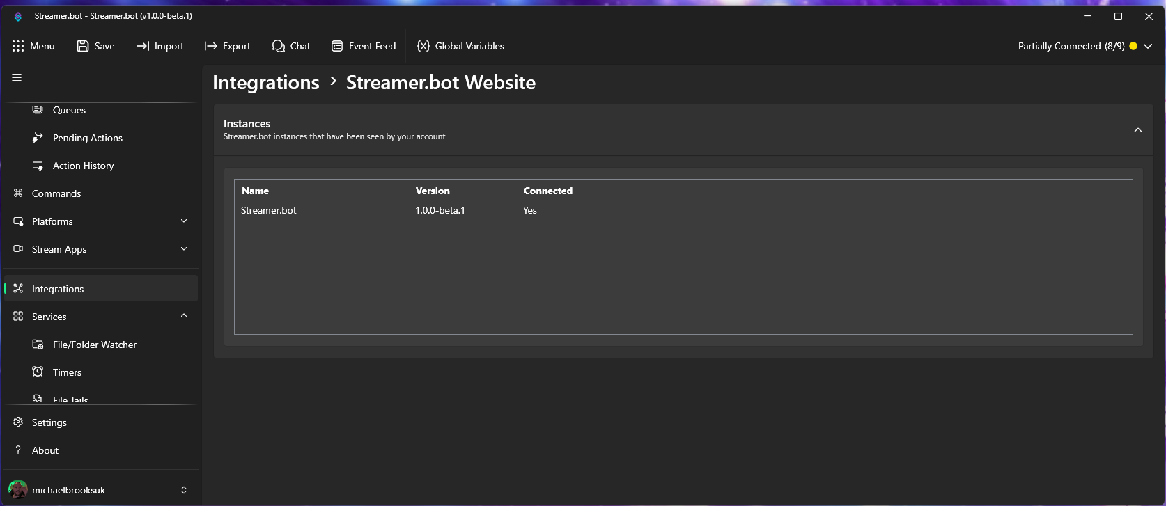 First, on the left side of the application, scroll down until you reach the Integrations section. Click on the link, then select "Streamer.bot Website" from the list. You should then click 'Login', which will direct you to the website's OAuth page, where you can log in. It should then appear in the list of instances.