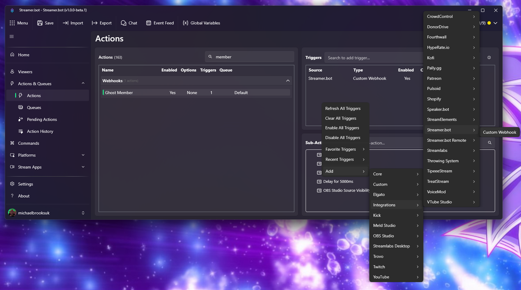 Within the triggers, to the right of your action, right-click and select Add > Integrations > Streamer.bot > Custom Webhook.